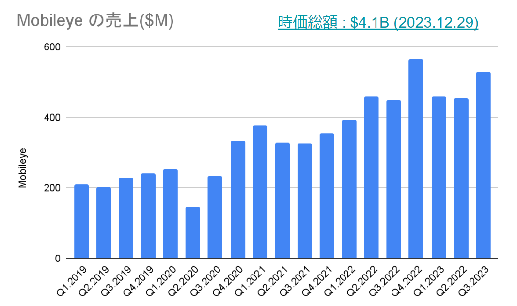 Mobileye (Intelが買収して、昨年再IPOしている)の売上は、下記のような感じ。直近では四半世紀で $500M の売上です。
