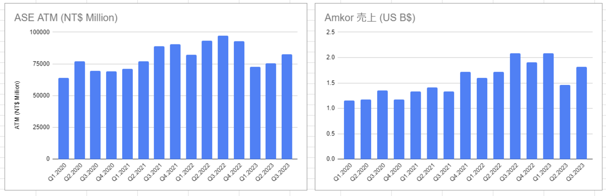 Amkor と ASE ATM の売上を比較してみました。売上の絶対値は違いますが傾向としては似ていますね。